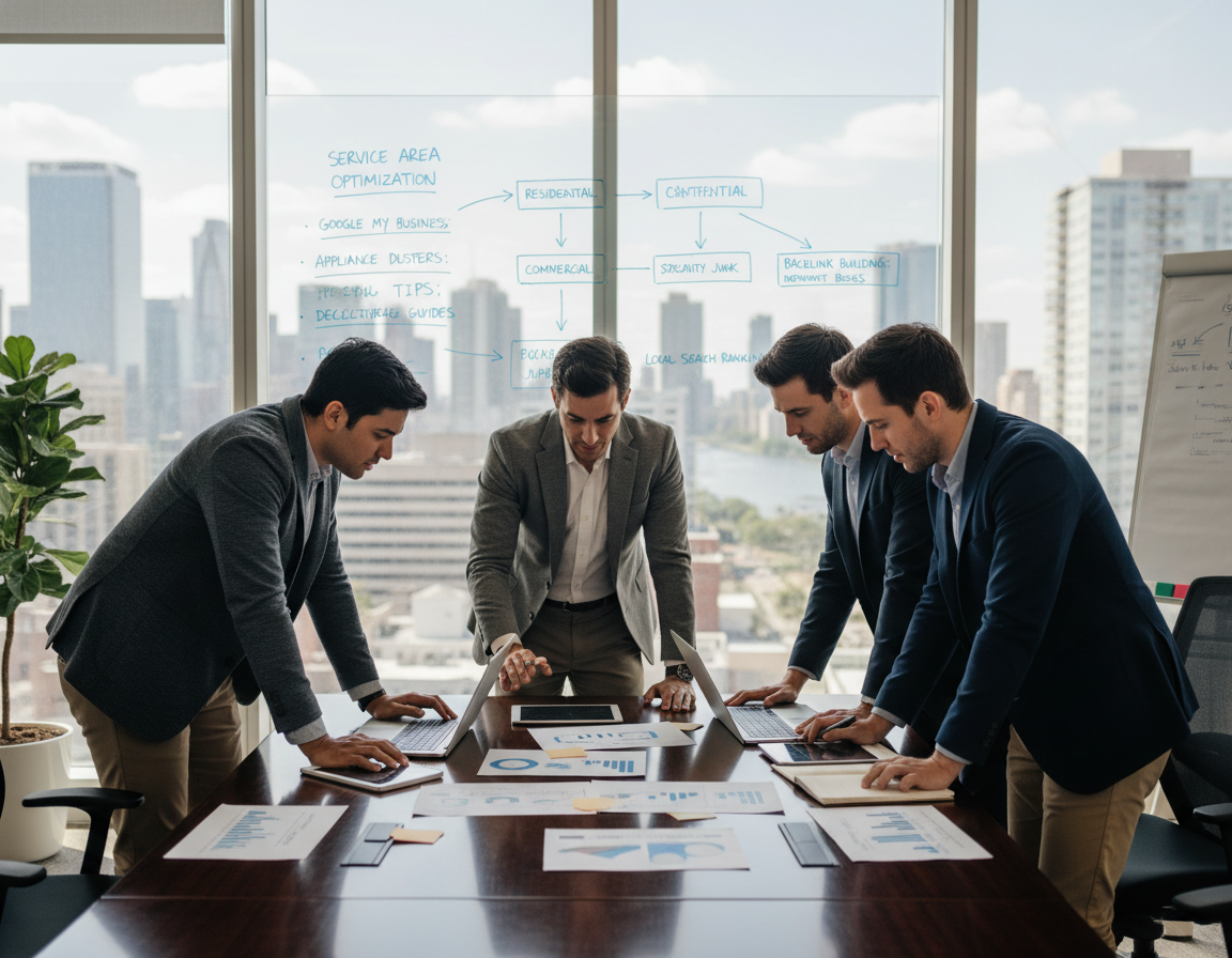 Google Business Profile, local schema, and targeted landing pages guide users to action. Listings with reviews, service types, and same-day availability prompt calls.